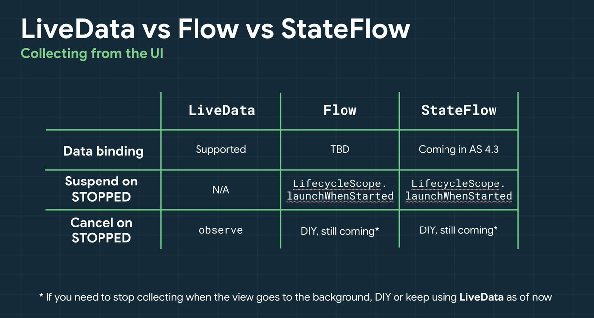 - View가 Stopped 상태가 되면 LiveData.observe() 는 자동으로 관찰을 취소하지만, StateFlow 는 다른 Flow에서 수집하는 경우 자동으로 중지하지 않는다. 동일한 동작을 실행하려면 LifeCycle.repeatOnLifecycle 블록에서 flow를 collect() 해야한다.